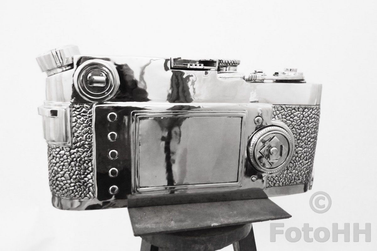 The sculptured camera is equipped with ‘Summar’ 2/5cm no.247425 (in a barrel resembling a collapsible Summicron), comes with wooden transportation box and original design drawing by Liao Yibai. The artist is known for creating hand-welded stainless steel sculptures of oversized watches, bags, rings and other luxury items, his work has been acclaimed and exhibited worldwide.