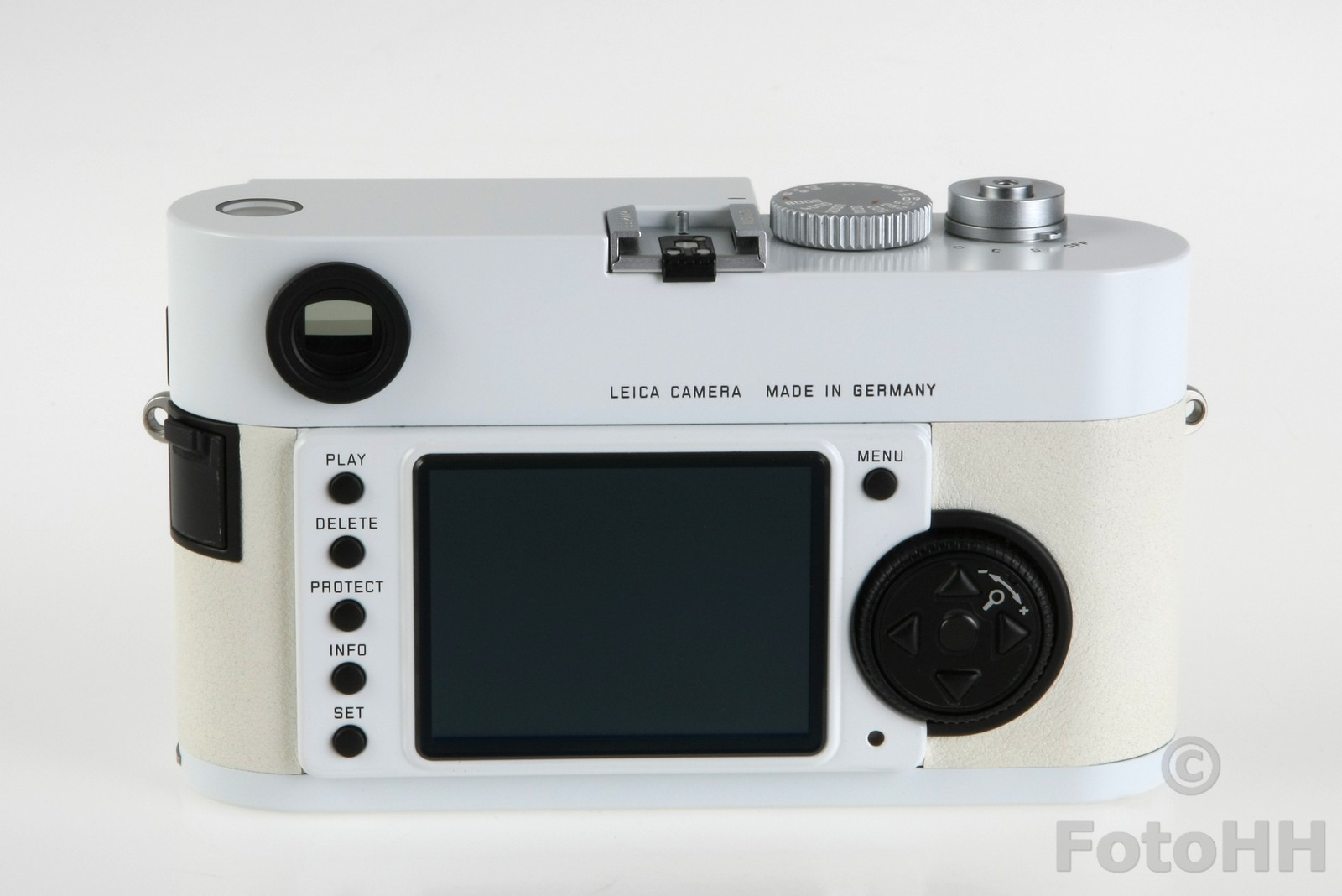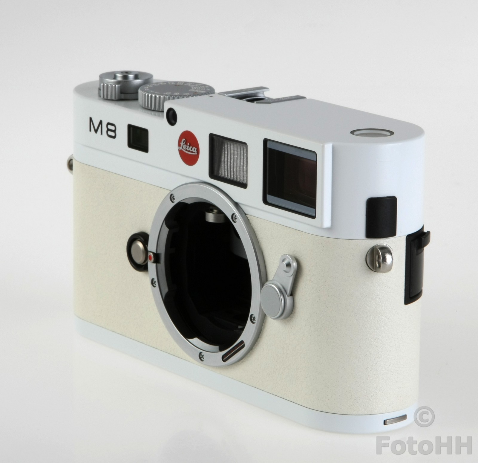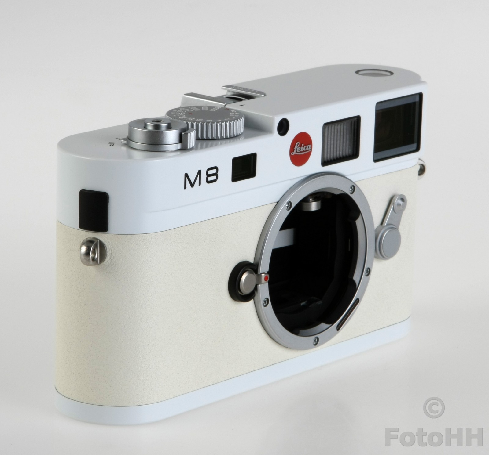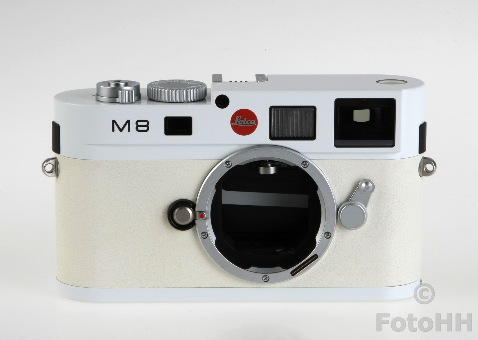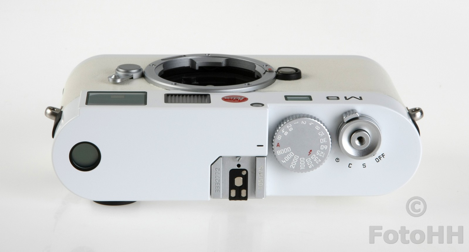 The top cover, bottom plate and the camera back are finished in white paint. The special paint finish is particularly resistant to wear and is characterised by its dirt-repelling surface. This finish provides the pure white camera with long-term protection against unsightly marks.