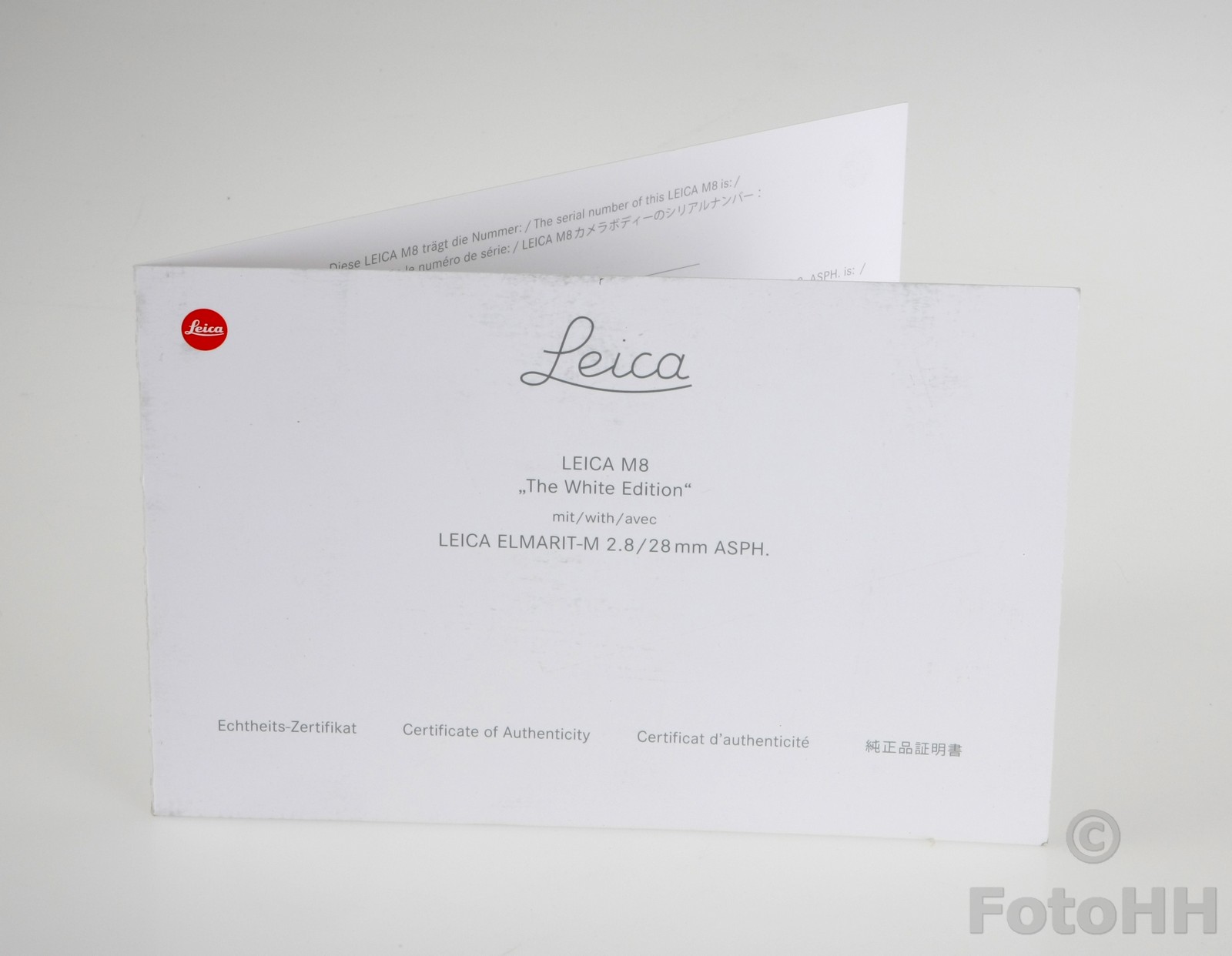 The technical specifications and features of the LEICA M8 'White Edition' are identical to those of the standard LEICA M8 models. Each camera of this special edition is also accompanied by its own unique certificate of authenticity of which this camera has got special serial number : 105/275 (body : 3332772) and has a total of 25.280 "clicks" made with it. It comes in the original Leica box with all the papers and authenticity certificate included of course.